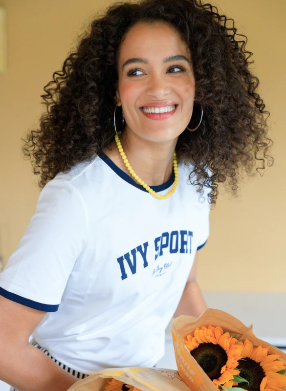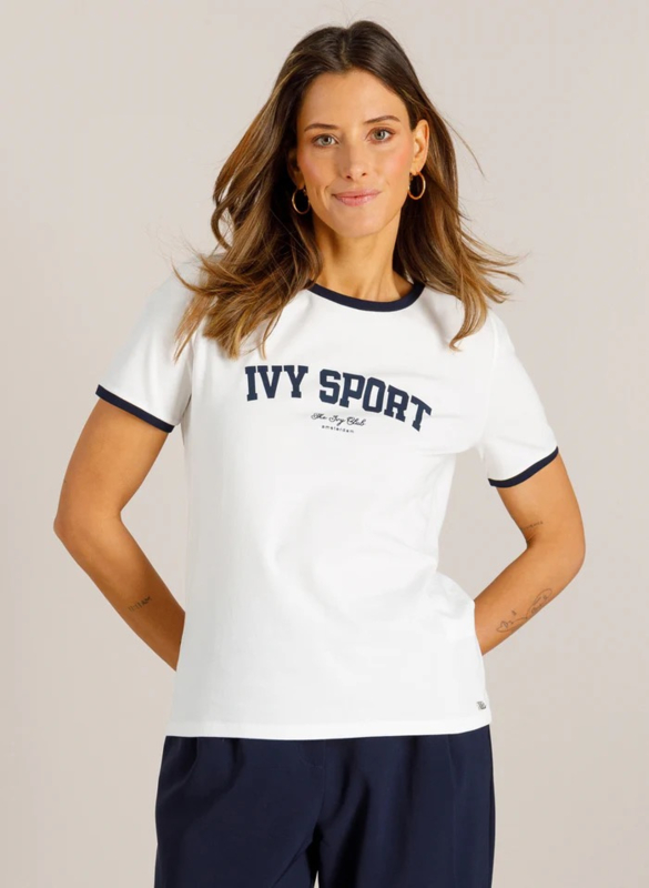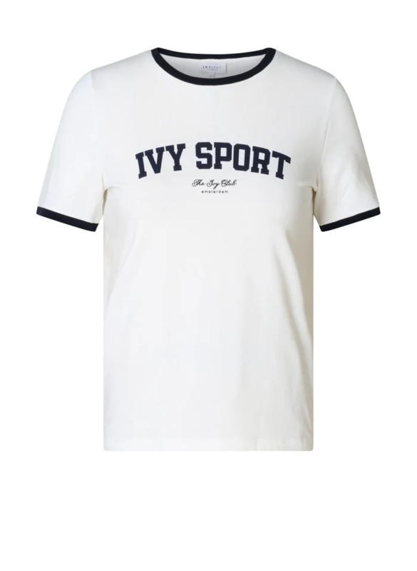 Sportief met een knipoog. Dit off-white T-shirt valt op door de contrasterende donkerblauwe biezen en de print op de borst. De zachte katoenmix draagt prettig en beweegt makkelijk mee. Ideaal om casual te combineren met denim of een relaxte pantalon.