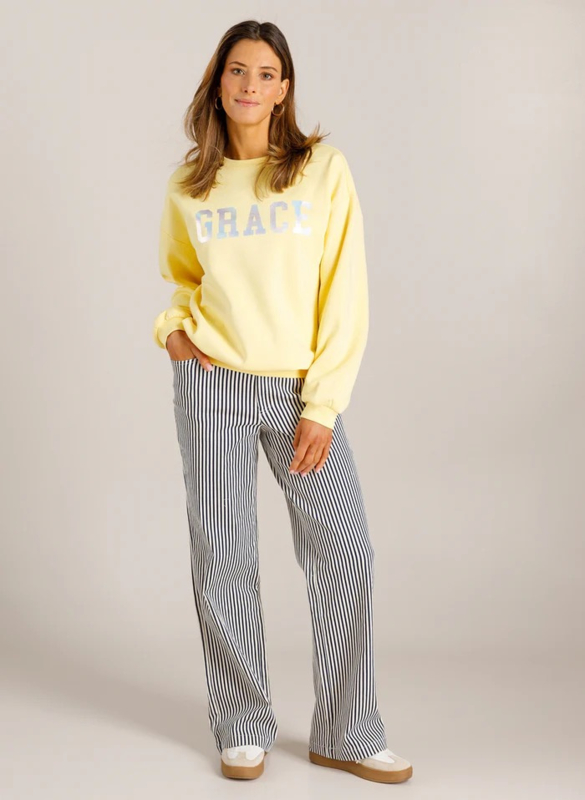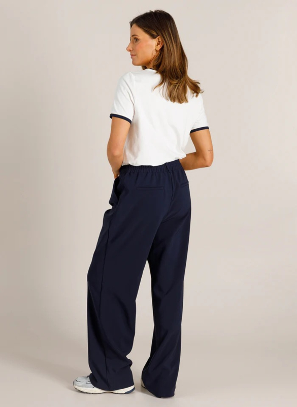 VIEN | OFF WHITE/NIGHT BLUEFrisse strepen en ultiem comfort – de Vien broek is een zomerse essential. De lichte katoenmix met stretch beweegt met je mee, terwijl de elastische tailleband zorgt voor extra gemak. Met rechte pijpen en een klassieke verticale…