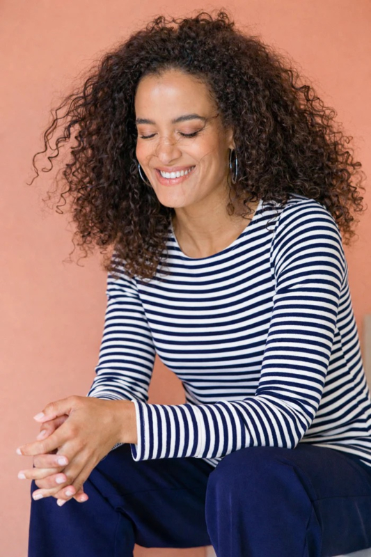 VENICE | OFF WHITE/NIGHT BLUEStreepjes blijven favoriet! De Venice top combineert een stevige jerseykwaliteit met een comfortabele pasvorm. De ronde hals en het lichte stretchgehalte maken hem heerlijk draagbaar. Dankzij de zwaardere stof blijft hij perfect…